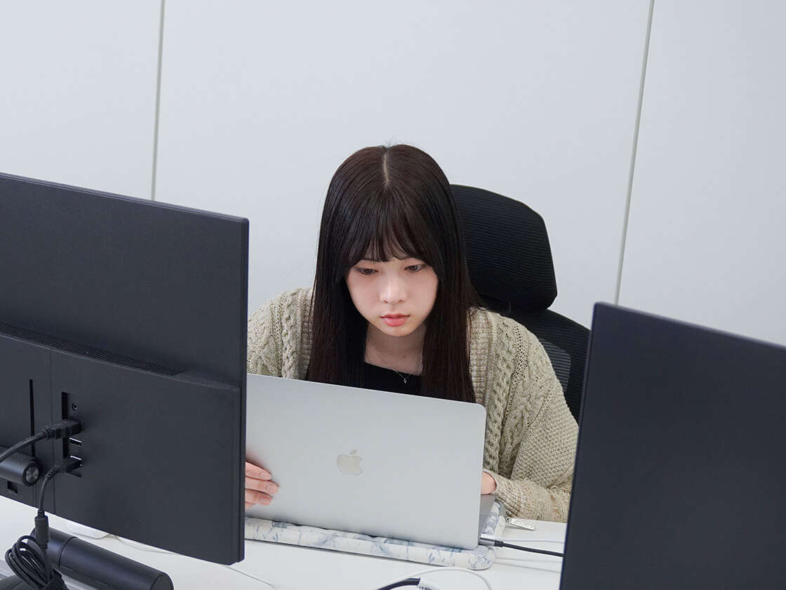 入社後はSNSに掲載される動画広告を作成しています。シナリオやテキストなどの言葉、映像や音声などの素材を用意して外部パートナーに編集を依頼。月に10本ほど制作しています。1つの動画をつくっているうちに同じテーマで違うアプローチが思い浮かぶので、スピードも速いほうだと思います。